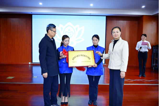 最激动人心的时刻当属揭牌环节。在全场期待的目光中,宣讲团顾问李徐英与中共蚌埠市委讲师团团长张雪松缓步上台,共同为“蚌埠市大慈义工协会薪火宣讲团”揭牌。红绸滑落,标志着宣讲团正式诞生,现场响起雷鸣般的掌声,掌声里满是对宣讲团未来的期待。随后,领导与嘉宾移步台前合影,用相机记录下这一意义非凡的瞬间。