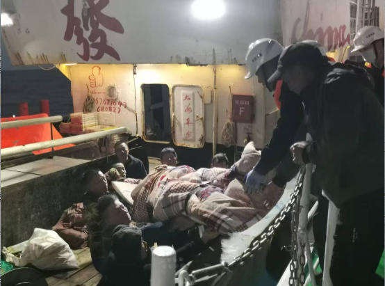 盐城海事局下辖的“海巡0616”接到指令后,也迅速驶离射阳港海事趸船码头,全速前往外海救援。与此同时,盐城海上搜救中心指引事发渔船与“海巡0616”相向而行,全速对接。盐城海上搜救中心通过卫星电话、微信与渔船商定两船会遇、人员转送等救助细节。两船成功帮靠,“海巡0616”海事救援人员从渔船上顺利将受伤渔民转接,并全速返航。航行过程中,“海巡0616”海事救援人员精心照料伤员,实时关注伤员生命体征情况,防止伤势损伤扩大。同时做好与东海救直升机伤员转运准备工作。