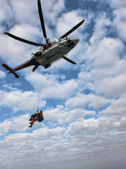 接到求助警情后,盐城海上搜救中心立即启动海上突发事件应急处置预案,紧急协调交通运输部东海救助局启动直升飞机救助准备,同时运用智慧海事信息平台定位渔船位置,并通过卫星电话、微信与船方建立联络,时刻掌握船舶动态、伤员情况。由于事发时海域距岸较远,已经超出驻守射阳通用机场的救助直升机的救援半径,盐城海上搜救中心随即指引渔船全速南下,驶往最近的上海港方向,同时协调120进行远程医疗指导伤员急救处置,及时掌握最新的船舶位置、航向、航速,持续向直升机救助机组通报海况、渔船动态及受伤渔民信息,指导渔船尽快清理渔船后方甲板,为搜寻救助行动提供必要的数据信息支持,在渔船进入直升机空中搜寻救助范围内实施救援。