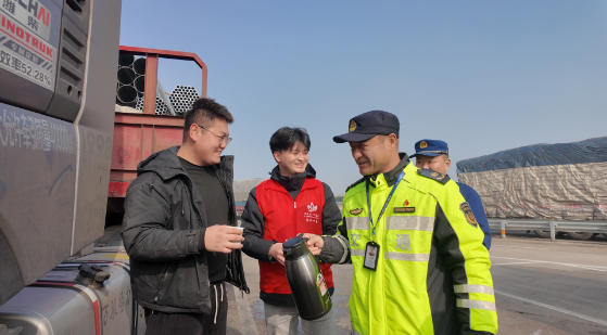 “兄弟,喝杯姜茶暖暖身子,天气冷,开车注意安全。”在“暖身暖意暖心田”饮品点,沿海支队第二大队志愿者将一杯冒着热气的姜汤递到司乘王先生手中。旁边的服务台上,血压计等简易设备也随时为有需要的朋友提供健康监测服务,工作人员在测量间隙,不忘轻声叮嘱几句冬季行车健康的注意事项。