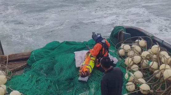 接到求助警情后,盐城海上搜救中心迅速启动海上突发事件应急处置预案,运用智慧海事信息平台锁定渔船所在位置,并与渔船取得联系,时刻掌握船舶动态和受伤渔民的情况。与此同时,盐城海上搜救中心紧急协调交通运输部东海救助局第一救助飞行队派驻射阳通用机场的救助直升机做好起飞救援的准备,并与射阳120急救中心取得联系,安排120救护车到机场等候,保证救助受伤渔民的直升机落地后,第一时间送到医院救治。由于渔船所在位置距离岸边较远,已经超出救助直升机的救助范围,盐城海上搜救中心随即指引渔船全速朝射阳港方向航行。中午13点左右,东海救助局第一救助飞行队的B-7357救助直升机从射阳通用机场起飞,经过一个小时的飞行后,救助直升机到达渔船的上空,机组人员克服海上风浪大、渔船摇晃不定等诸多困难,采用担架吊运的方式,成功将受伤渔民吊运进救助直升机机舱。据同船的渔民讲,在捕捞起网的过程中,弹起的网绳击打到该渔民的腹部导致受伤。