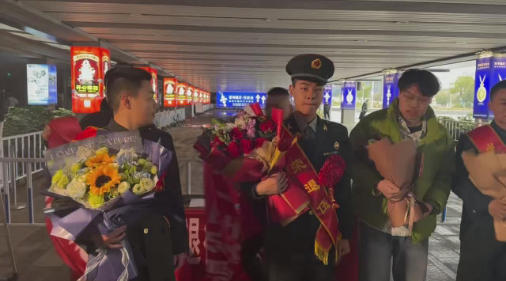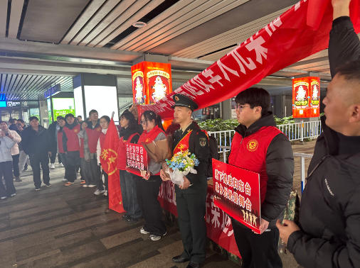 活动当天,青少年志愿者们身着“戎耀东台”志愿服装,手持鲜花与欢迎标语,早早在出站口整齐列队,满怀期待等候退役军人归来。当列车缓缓驶入站台,身着戎装、身姿挺拔的退役军人依次走出,志愿者们立刻送上热烈掌声与欢呼声,将一束束鲜花递到老兵手中,一句句“欢迎回家”“致敬军人”的问候真挚温暖。志愿者们主动帮忙搬运行李、引导出站,用细致贴心的服务,让返乡军人一踏上故土便感受到浓浓的尊崇与关怀。