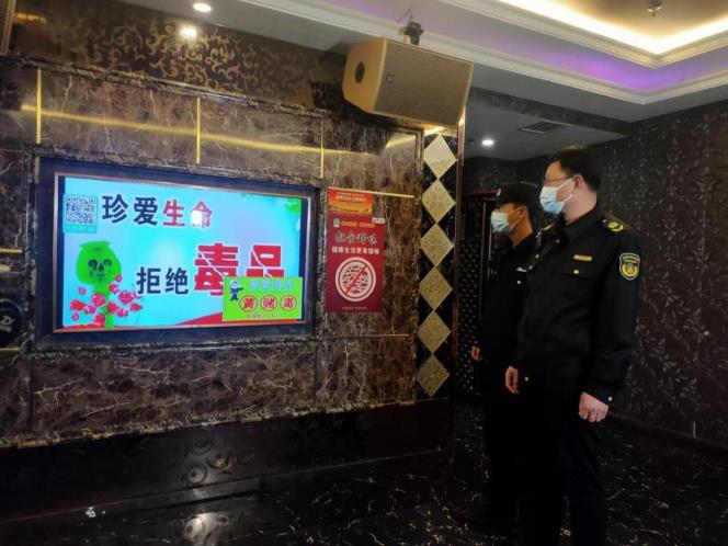 积极配合公安、市场监督管理等部门,定期不定期开展例行检查和突击检查,严厉打击不法分子利用娱乐场所贩卖、吸食毒品等违法犯罪活动;要求各文化娱乐经营场所在场所内悬挂禁毒宣传横幅、张贴禁毒公告,坚决遏制合成毒品在公共娱乐场所发展蔓延。扎实开展文化旅游市场禁毒宣传工作,在景区景点、公共文化场馆设计制作安装大型禁毒宣传牌,通过文化市场综合执法禁毒宣传车电子屏滚动宣传、发放禁毒小折页宣传品、宣讲毒品危害性等多种方式,进一步扩大禁毒宣传覆盖面