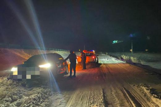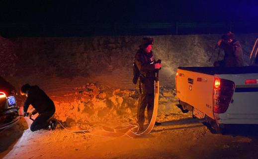 2月2日,新巴尔虎右旗呼伦镇等局部地区气温骤降,受到暴风雪和严寒天气的影响,部分路段交通受阻。当晚21时55分许,新右旗公安局呼伦边境派出所民警接到苗某求助称,在呼伦镇南侧满西公路行驶时,迎面驶来一辆车,因雪天能见度较低,避让对向车辆时不慎陷入雪中。接到求助后,民警迅速到达现场,利用拖车绳拖拽和助推等方式,成功将车辆拖出被困地点。