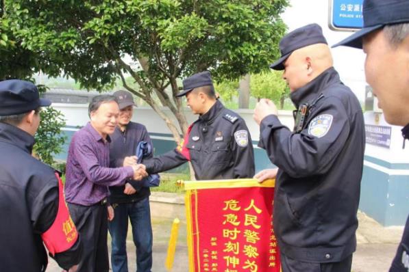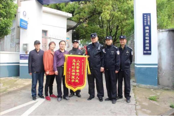 4月13日,家住株洲的董奶奶的儿女将一面印有“人民警察为人民 危急时刻伸援手”的锦旗送至长沙铁路公安处株洲北站派出所民警手中,感谢民警深夜送母亲回家。