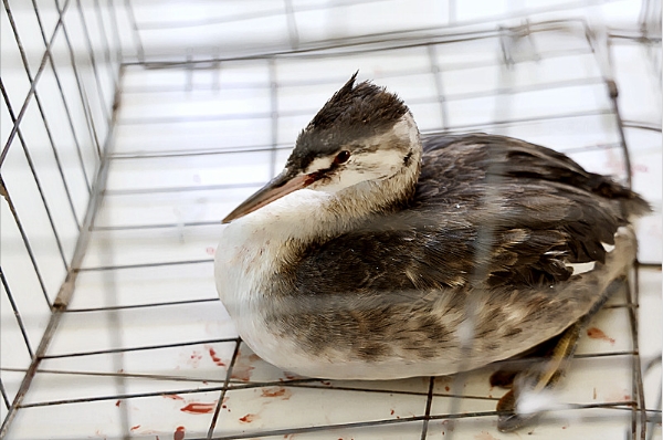 经食药环大队民警查看,该鸟虹膜黑褐色,嘴黑色,基部黄色,跗蹠黑色,内侧微缀有一点黄绿色,属于国家二级保护动物——赤颈鸊鷉(pì tī)。因左侧翅膀受伤无法正常飞翔。随后,食药环大队民警对其翅膀进行消毒、包扎处理,并带回食药环大队喂养,待其具备正常飞翔能力后再放归大自然。