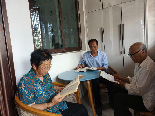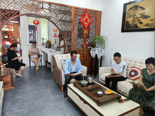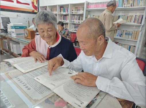 书屋一角,几位留守老人正护捧着《射阳民间故事集》轻声朗读。72 岁的李用驹,逐字念着临海镇盐文化的章节,老人们听得入神,还会补充自己知道的老故事。“年轻时没机会多读书,现在家门口的书屋能学种庄稼、听家乡故事,日子有滋味!” 李用驹笑着说。