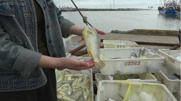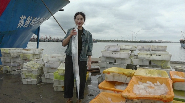 10月14日下午4点钟左右,在国家中心渔港—射阳县黄沙港一期码头,一艘中午才进港的渔船正在卸货,整箱的黄鱼、带鱼、鱿鱼、鲳鱼、海鳗鱼等海洋鱼类通过传送带,从渔船的船舱里被转运上岸,吸引了众多市民和商贩前来挑选采购。据渔船老板娘陆迎介绍,这个航次的产量不是太高,船上大概有5000多箱鱼获物,主要品种就是黄鱼、带鱼、鱿鱼、鲳鱼、海鳗鱼等海洋鱼类。说话间,陆迎还挑选出长达一米五左右的特级老鹰带鱼、重量超过一斤的鲳鱼、直径有手腕粗的海鳗鱼、以及接近一斤左右的黄鱼和新鲜度一级的鱿鱼向笔者展示。陆迎告诉笔者,近年来,随着科学技术的进步,人工养殖黄鱼也得到了长足发展,但养殖的黄鱼口感没有野生的黄鱼好,广大市民在菜市场挑选黄鱼时,只要观看黄鱼两侧的鱼鳍(也称为鱼划子),野生黄鱼的鱼鳍反过来后,一般都会到达眼睛的部位,而人工养殖黄鱼的鱼鳍比较短,基本够不到眼睛那里。